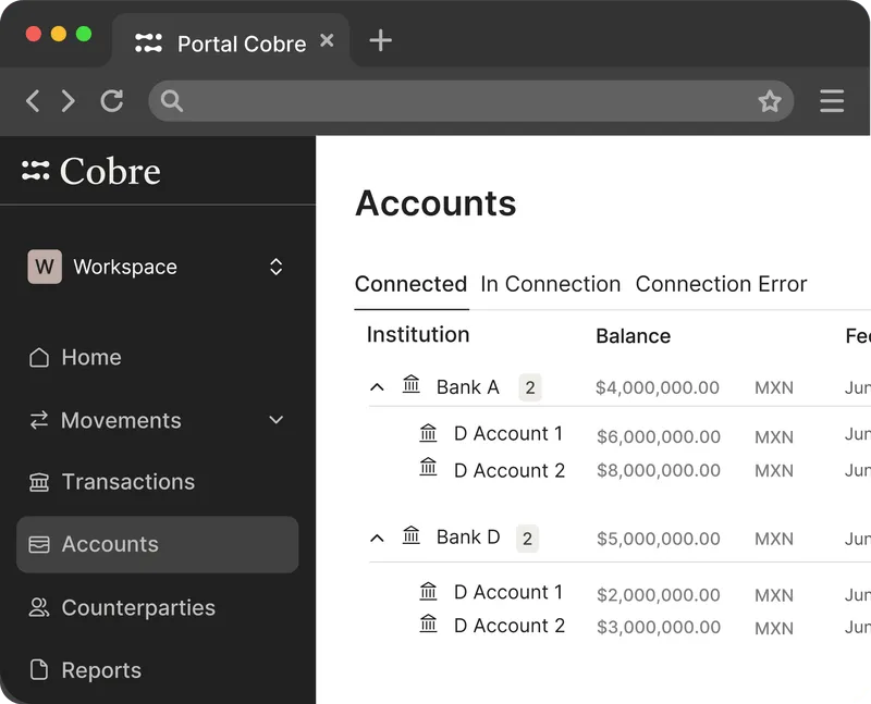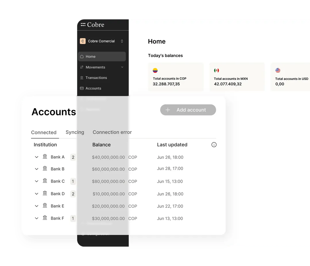 Cobre Connect simplifies multi-bank operations by consolidating accounts from leading banks in Mexico and Colombia into a single platform. It gives finance teams real-time visibility and automates key workflows such as payments, reconciliations, and reporting